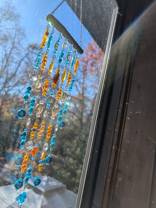 One of a Kind Driftwood Sun Catcher for Window Teal and Orange
