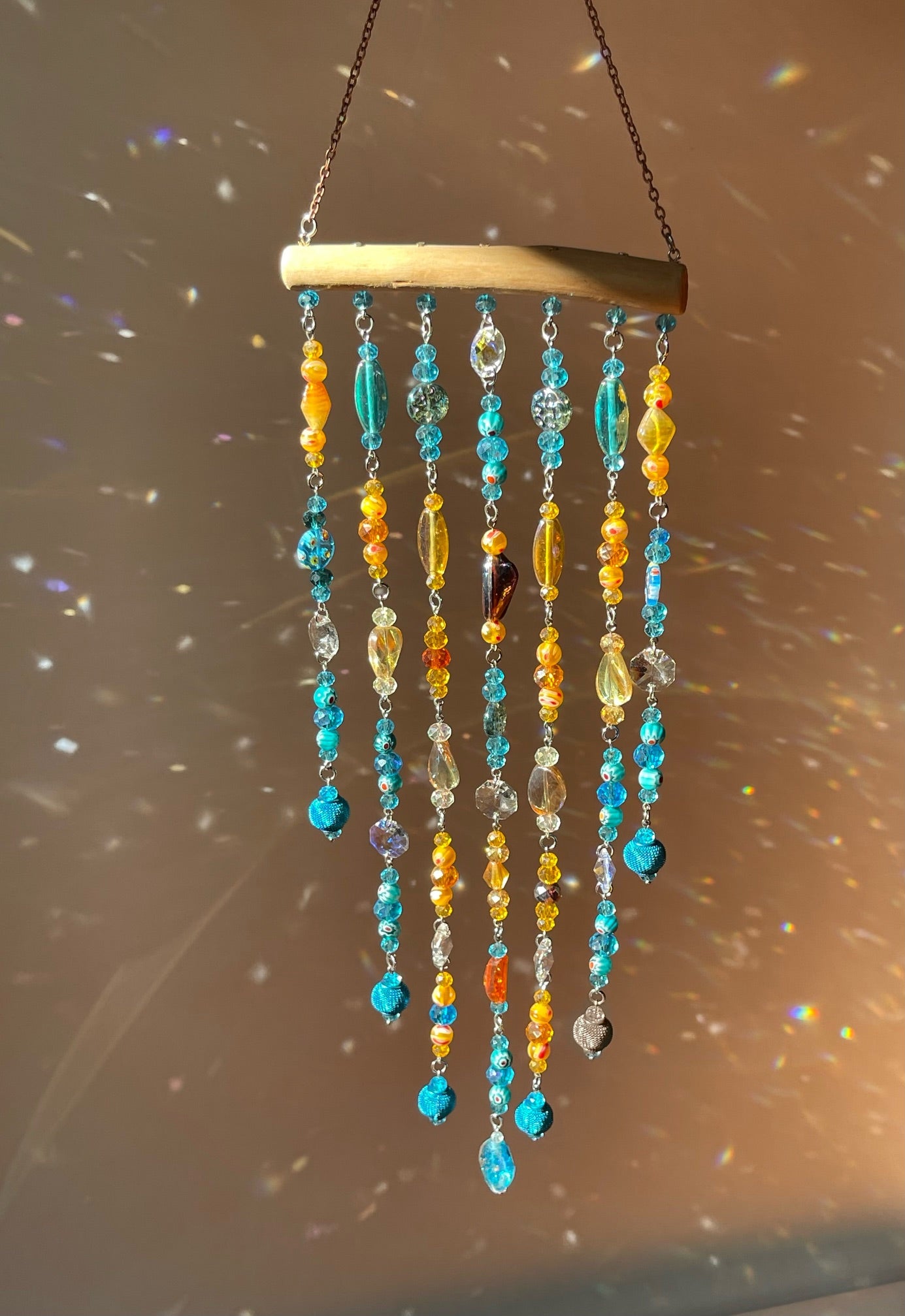 This is a handmade one-of-a-kind sun catcher to hang in your window. Suspended from a 5" piece of bleached driftwood it contains an assortment of rainbow maker crystals, large assorted shapes in teal and orange glass crystal beads.