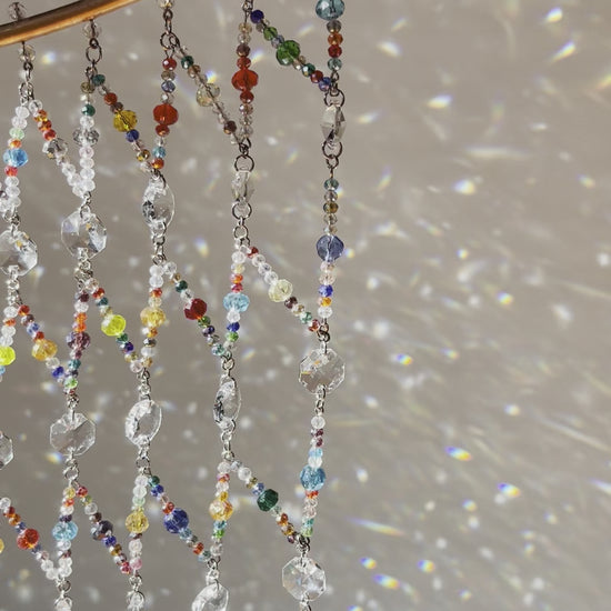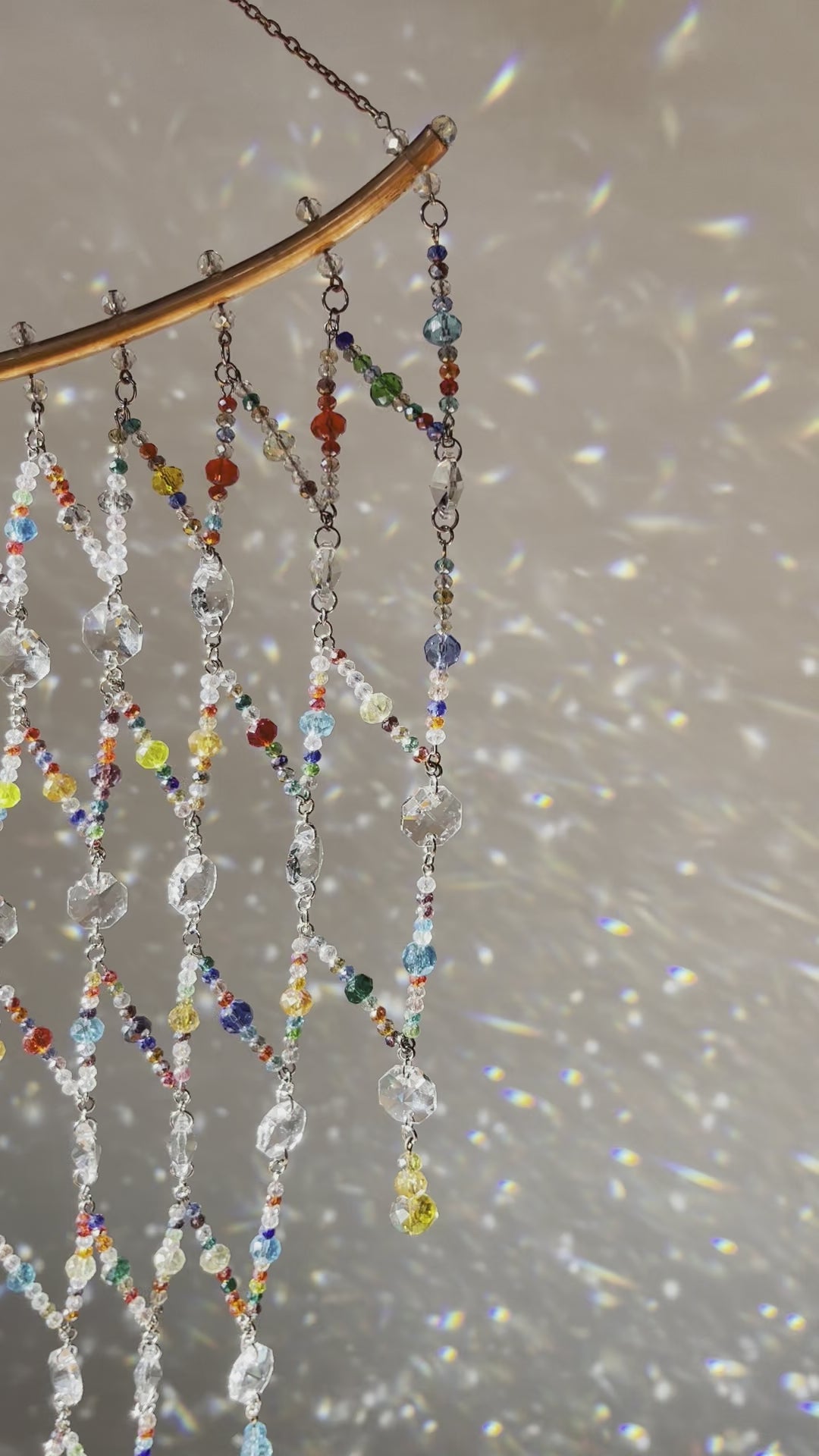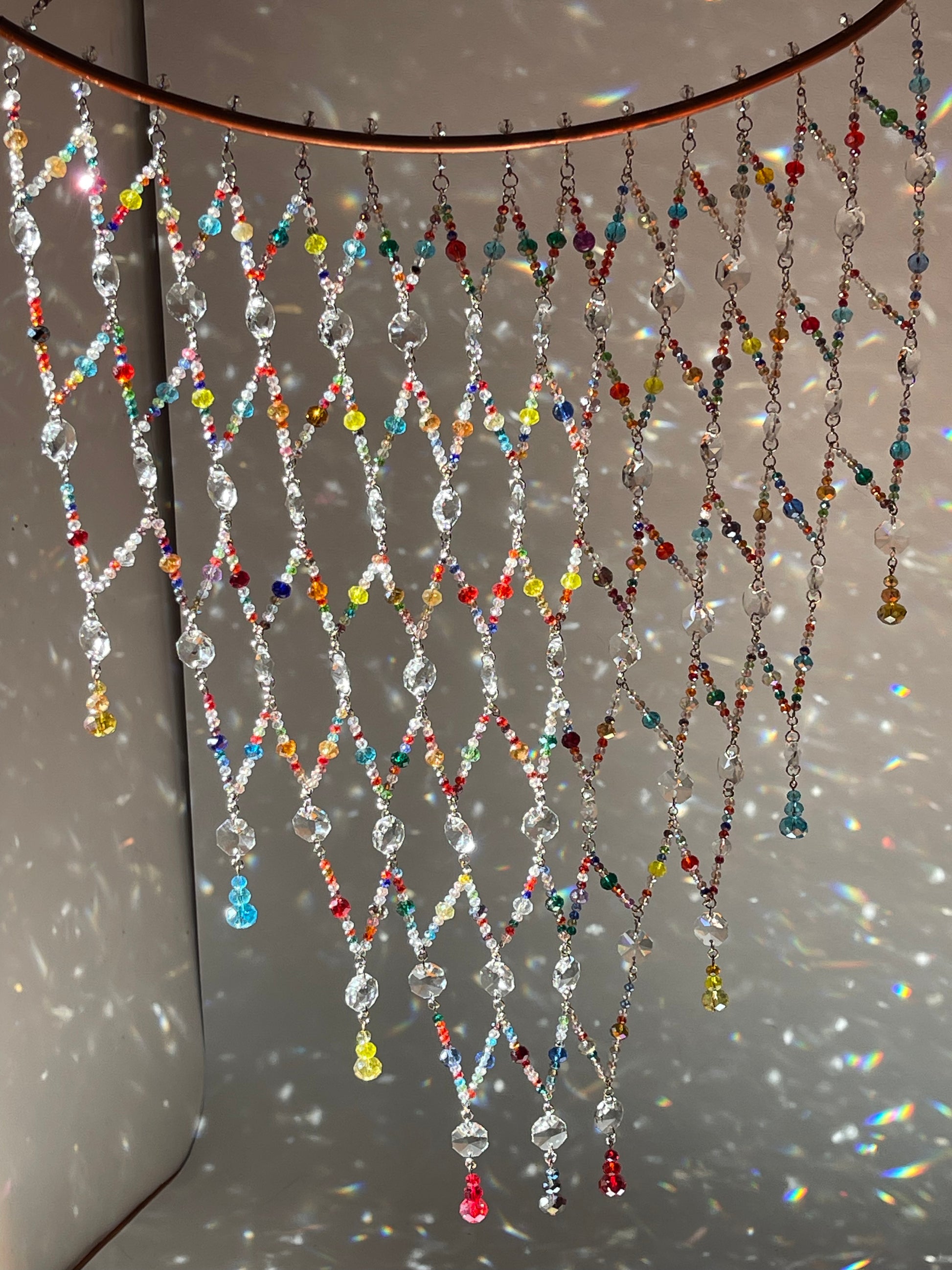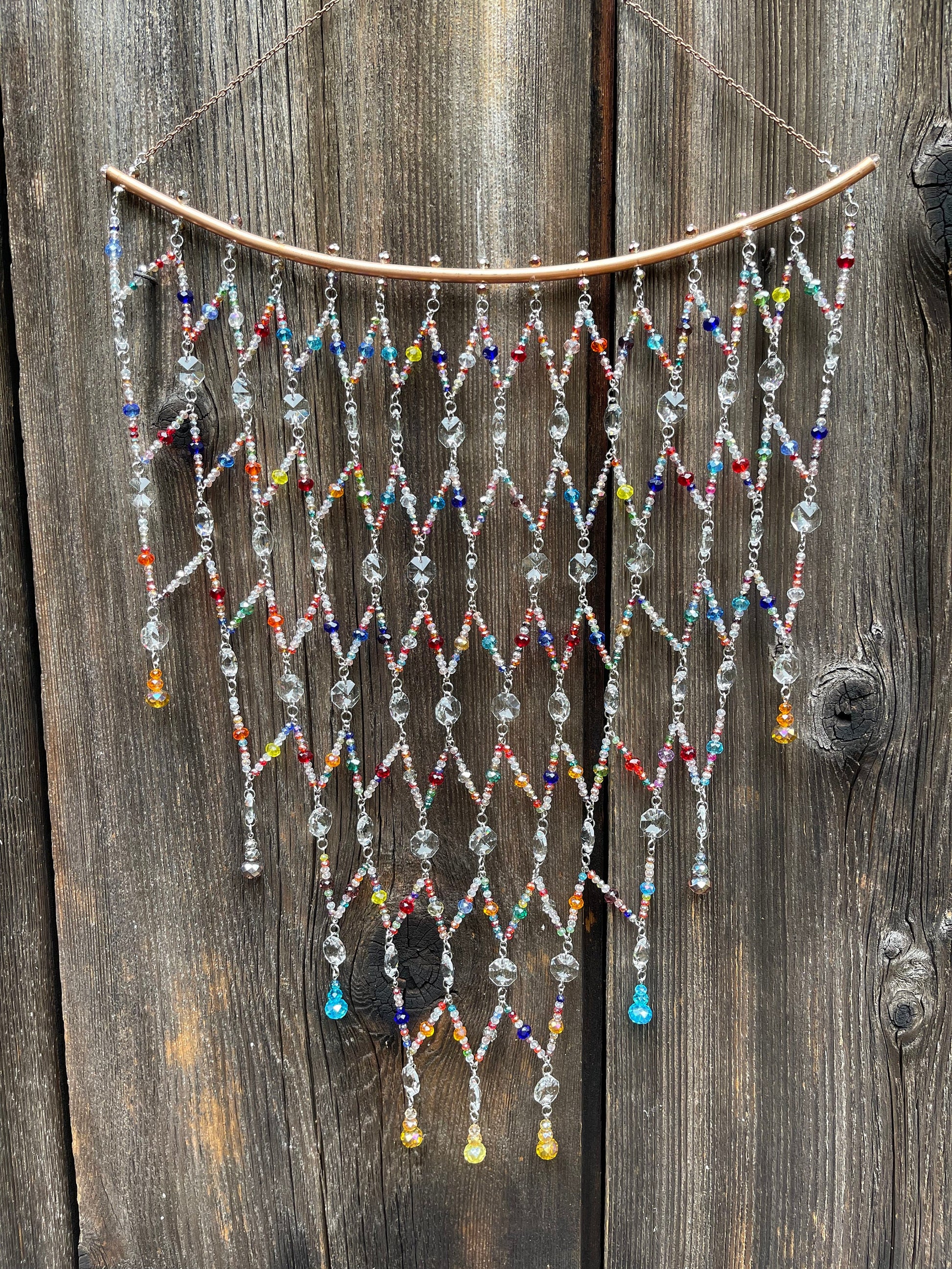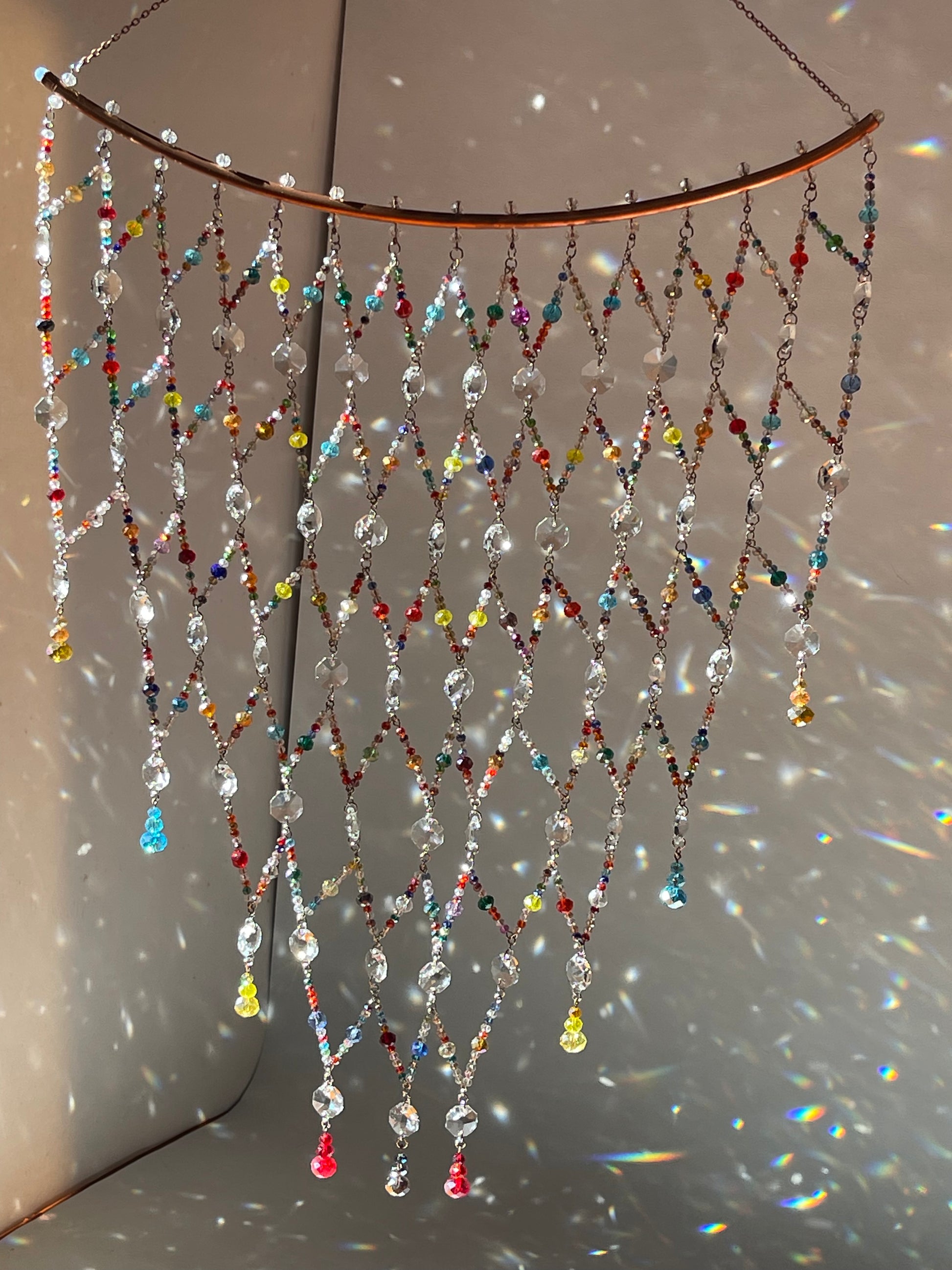This is a hand made beaded crystal sun catcher is made from tiny glass crystals interwoven on a copper pipe. A truly spectacular show piece to add drama to any space. Hang this in your window and allow it to catch the sunlight so the rainbow maker crystals will refract into rainbows through out the day. At night the small facets will pick up electric light so that it will shine and sparkle into the night.