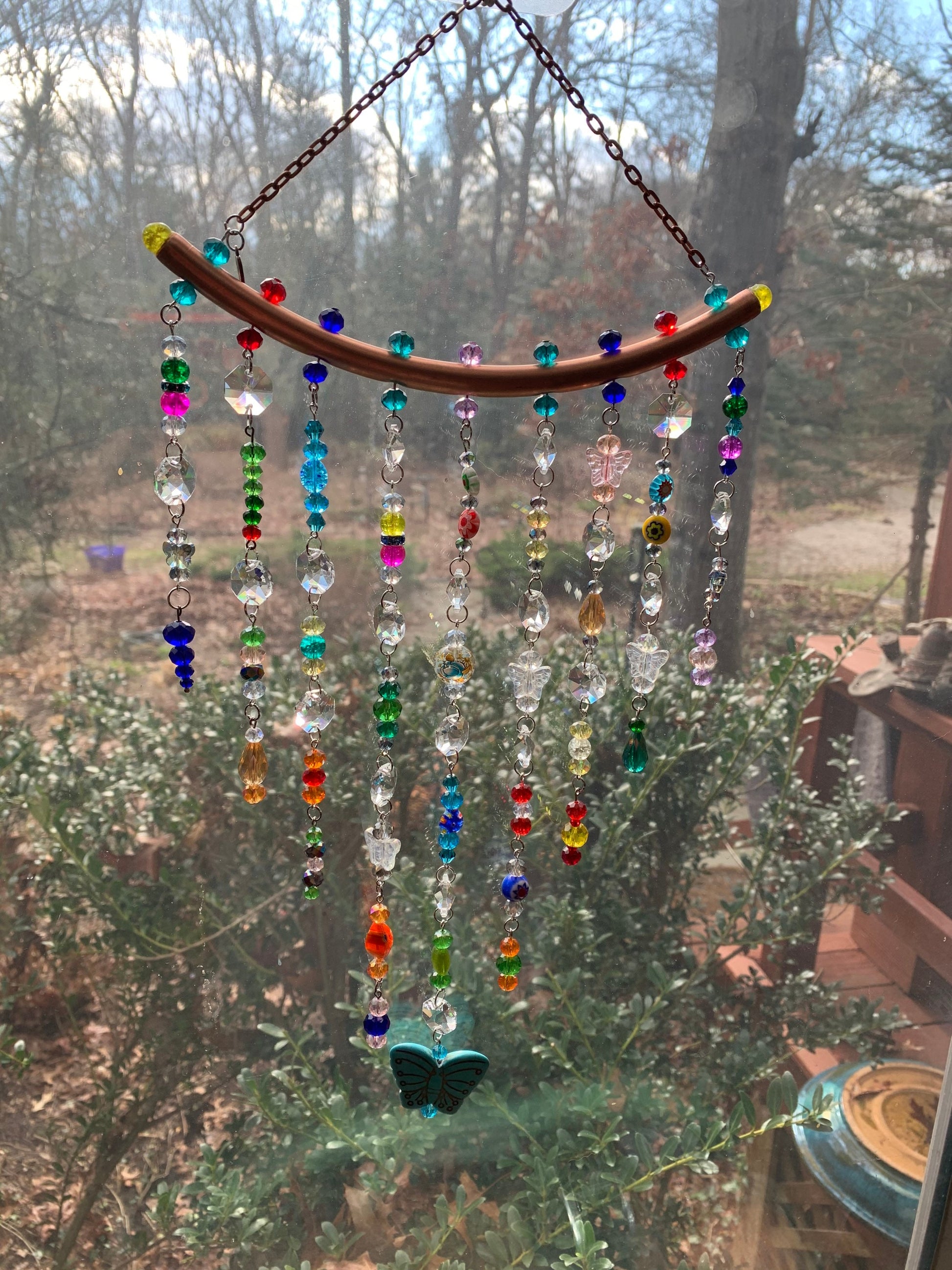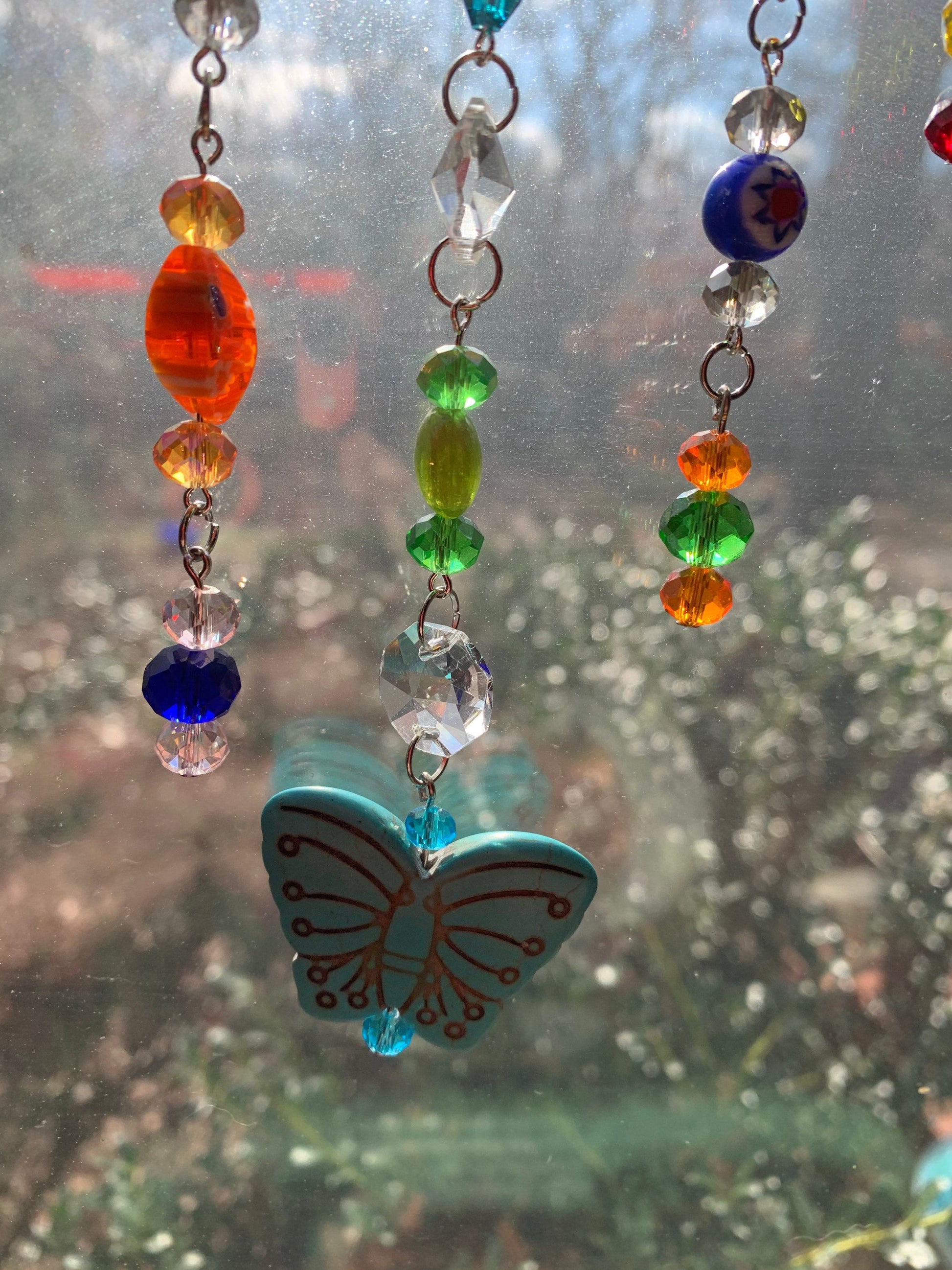 These sun catchers are made to order and are perfect for the butterfly lover! A colorful creation using high quality glass crystal beads incorporating different colors of glass crystal, sprinkled between the multicolored crystals are colored various Butterly shaped beads. Finished with a 1.5 inch colorful stone butterfly.