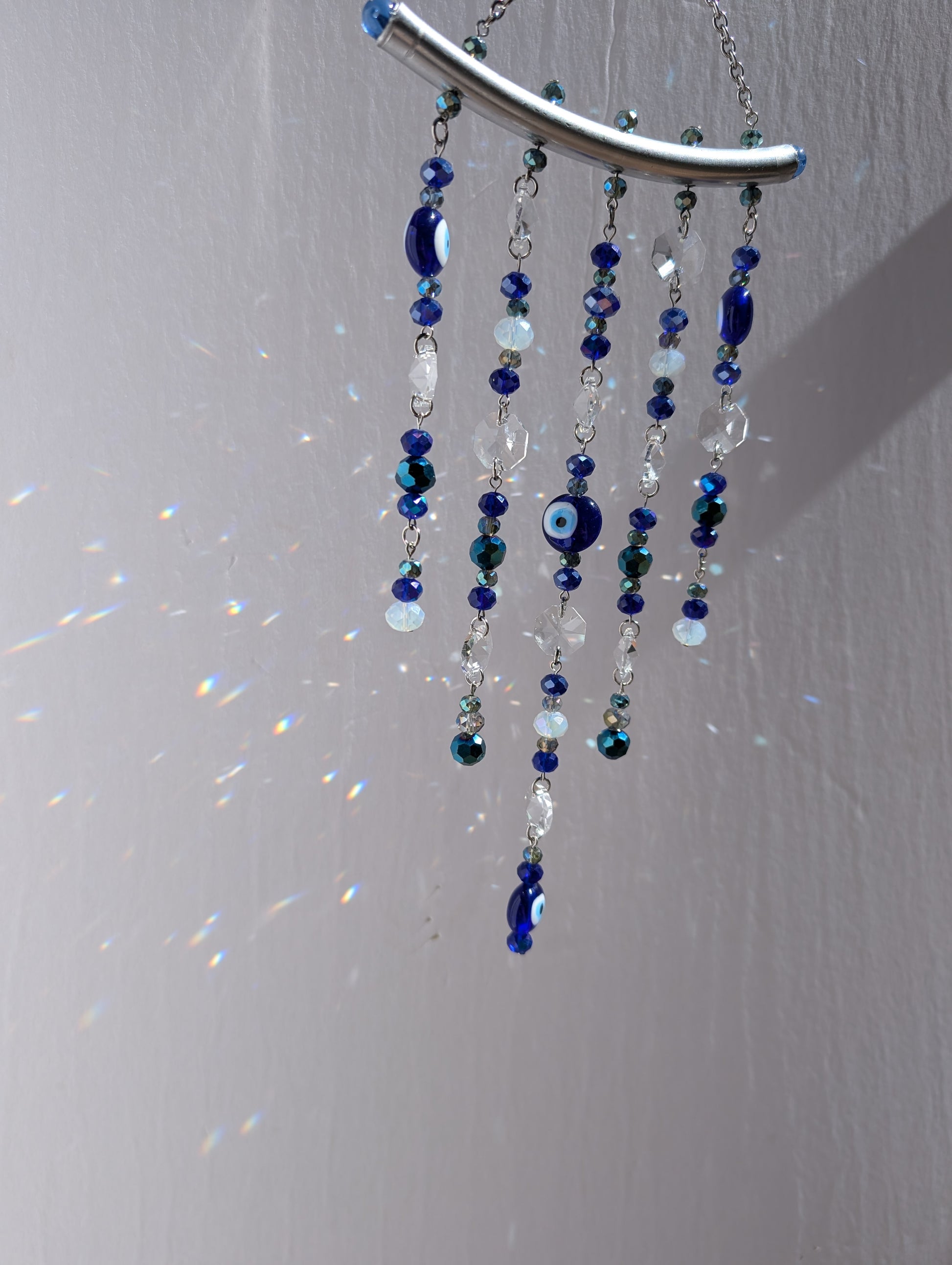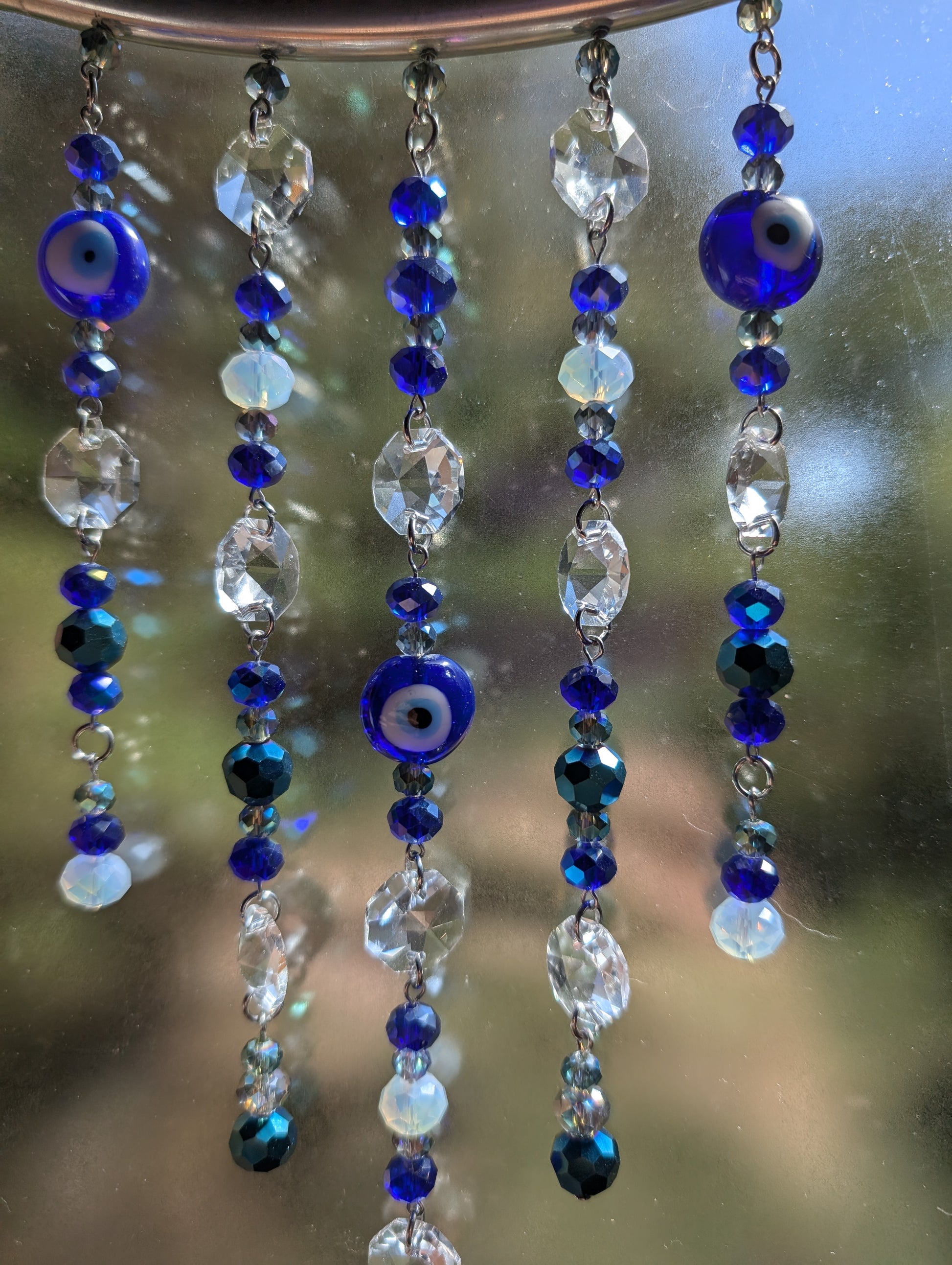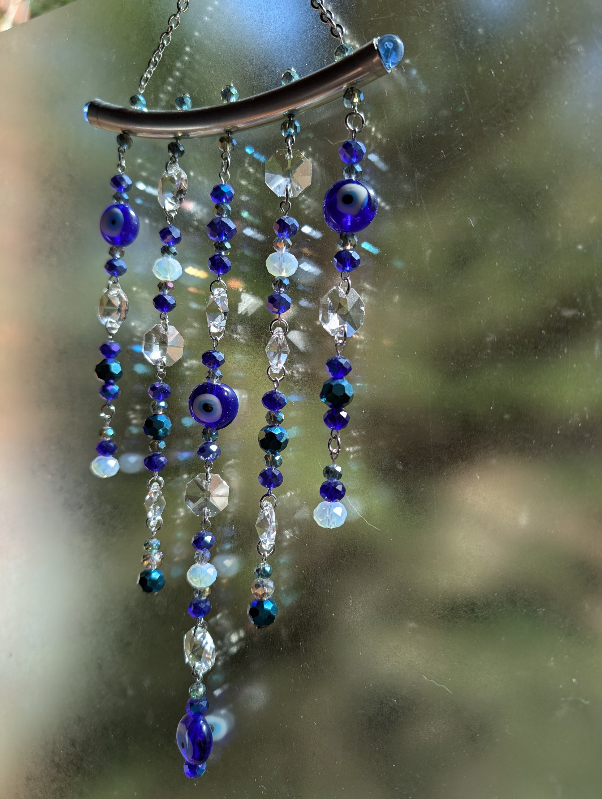 This suncatcher is made using four handcrafted evil eye charms (otherwise known as nazar) the symbol has been around since antiquity and is known for warding off the effects of the evil eye. Hang this in your house to protect yourself from the effects of jealousies and all-around protection for you and your family. If hung by the entrance of your house, it will protect you from bad energies that would enter your home.